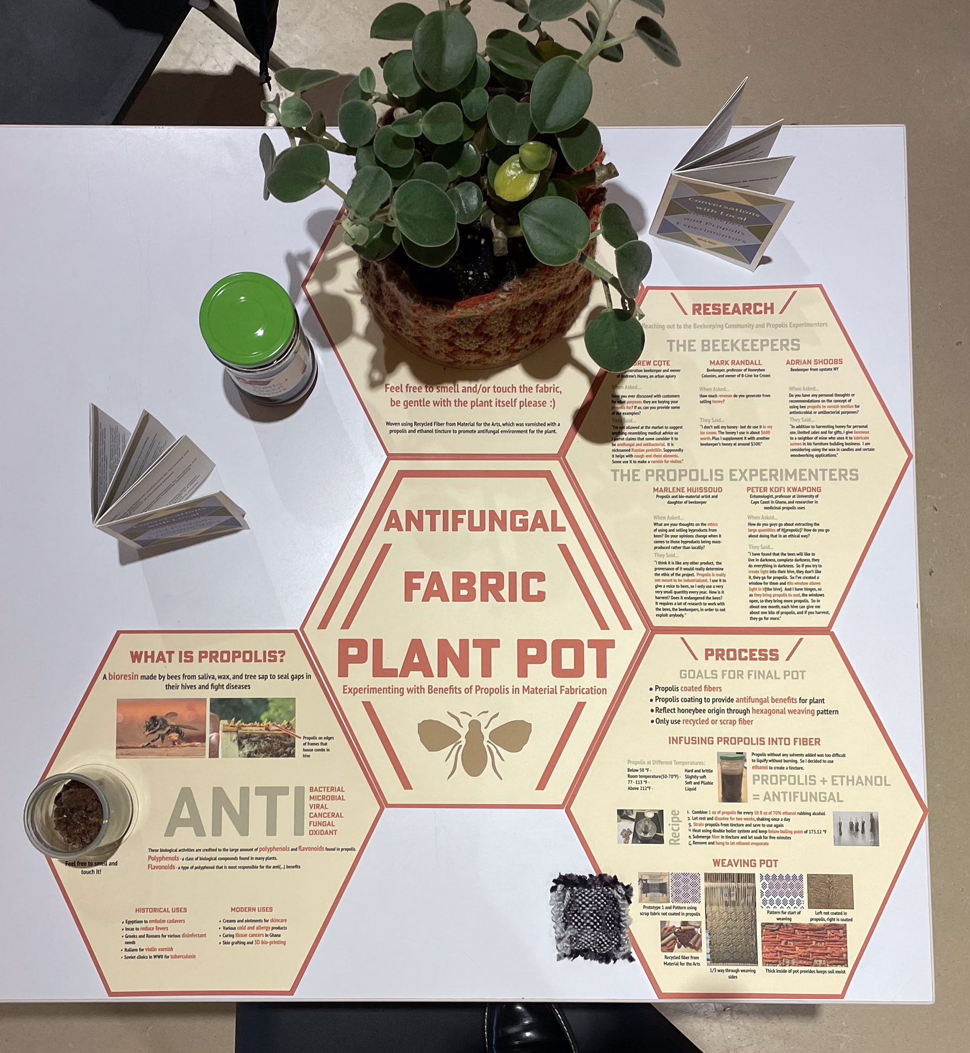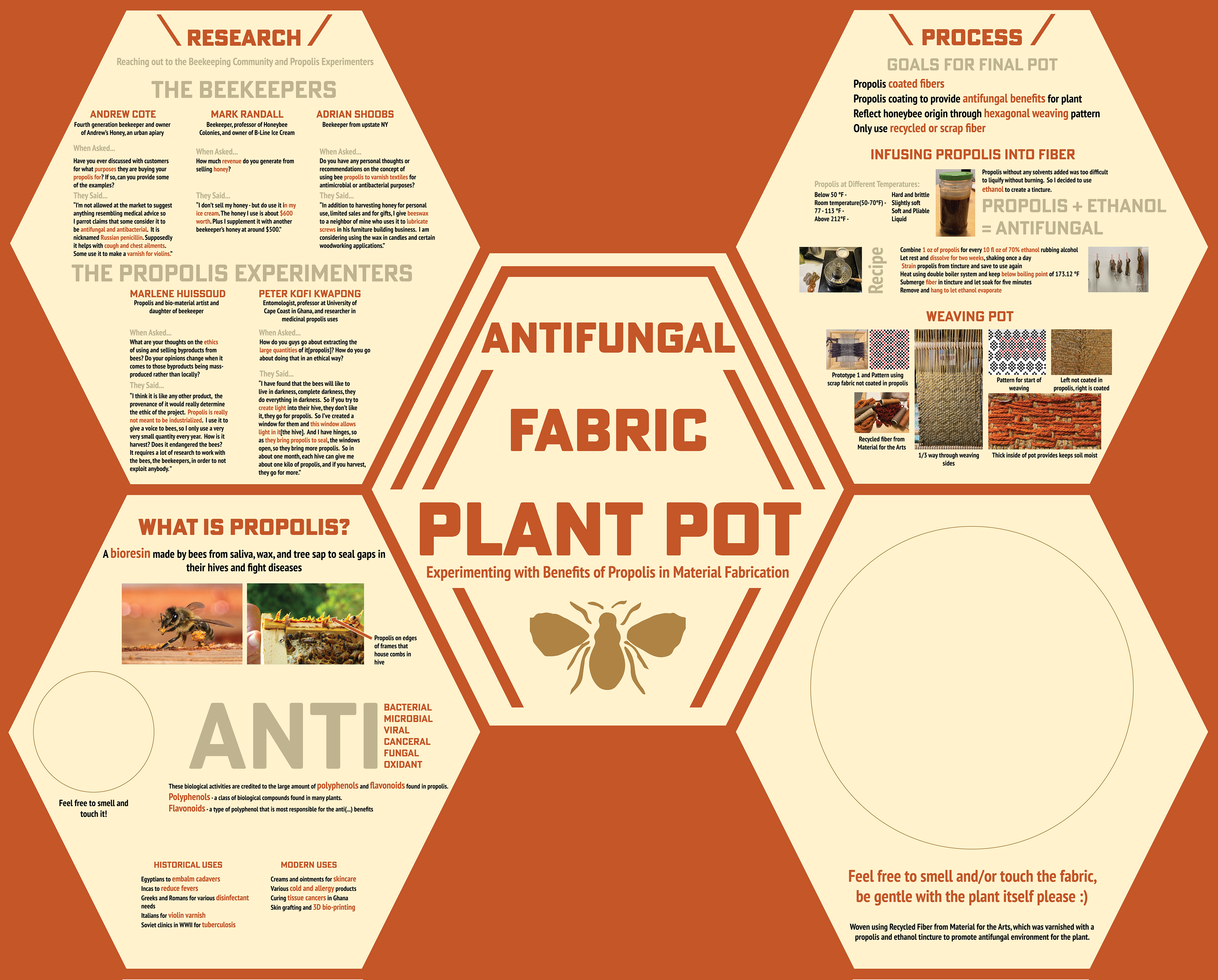 In my junior year of my Integrated Design program I studied the potential benefits of propolis through the fabrication of a fabric plant pot. Propolis is a byproduct that honeybees create as glue for their hives. When honey is harvested by beekeepers, they often will harvest some of the propolis as well. Propolis has been found to have varying anti-bacterial and anti-oxidant effects on human health. I was introduced to propolis through another course I took junior year called Honeybee Colonies where we studied the entymolygy of honeybees and culture and history of beekeeping. The main component of this project was the hand-woven plant pot, however I wanted to come up with an inventive and beautiful way to present my research for this project as well. To do so, I created these five honeycomb shaped posters that I planned to have sit beneath my pot on presentation day. For their graphic design I was inspired by the fonts and imagery used on historical honey packaging, as well as one of my personal favorite graphic design eras, Constructivism.