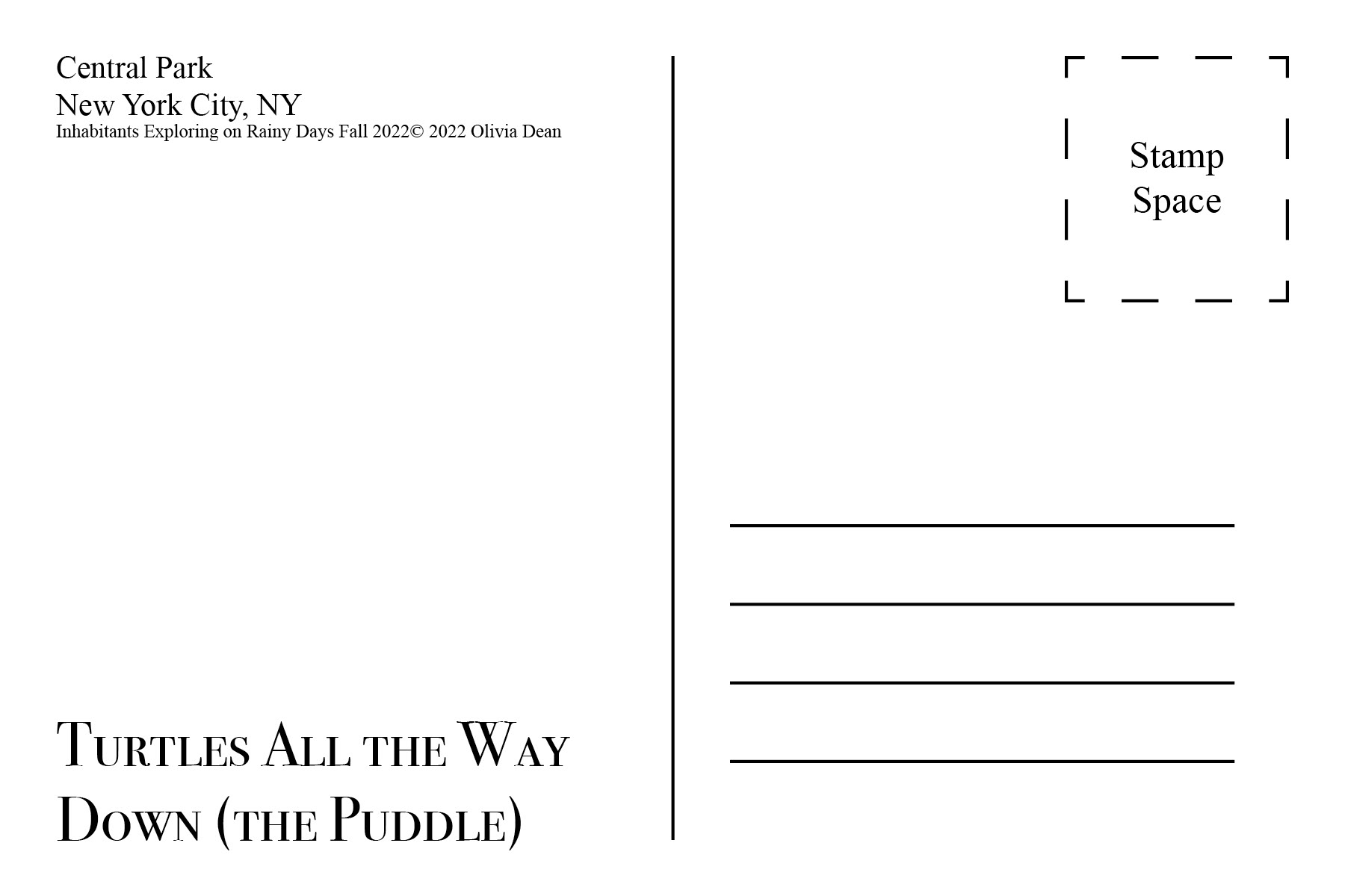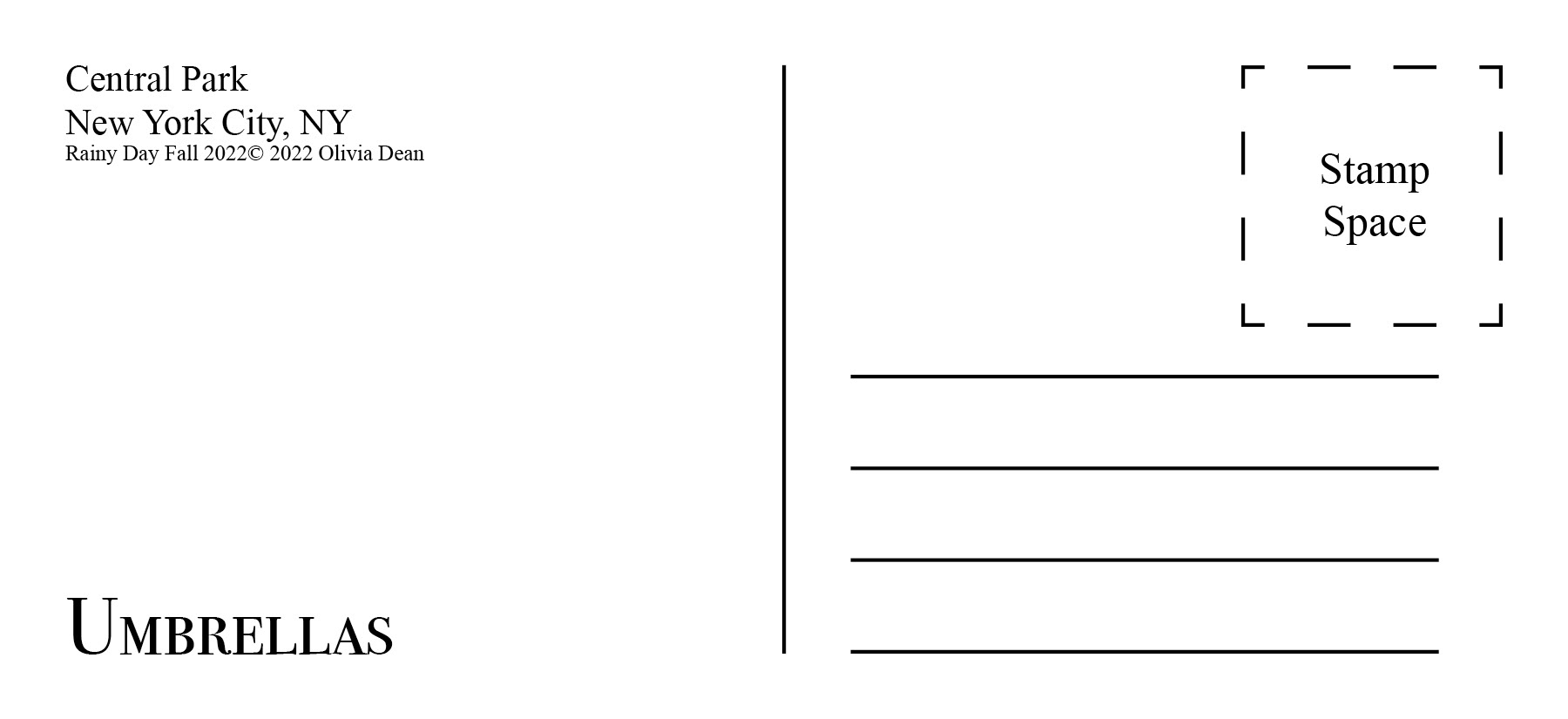 Through photographing areas of Central Park I created a series of postcards that represent the people, animals, and environment of Central Park during the Fall season. I experimented a lot with these images through layering images on top of one another.