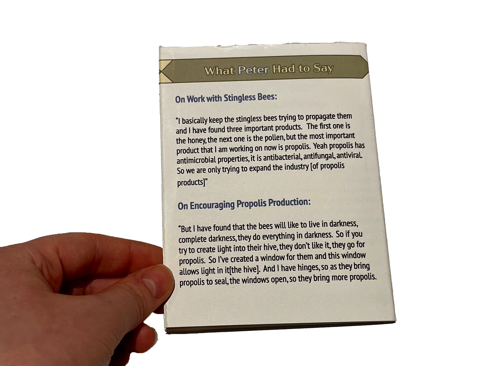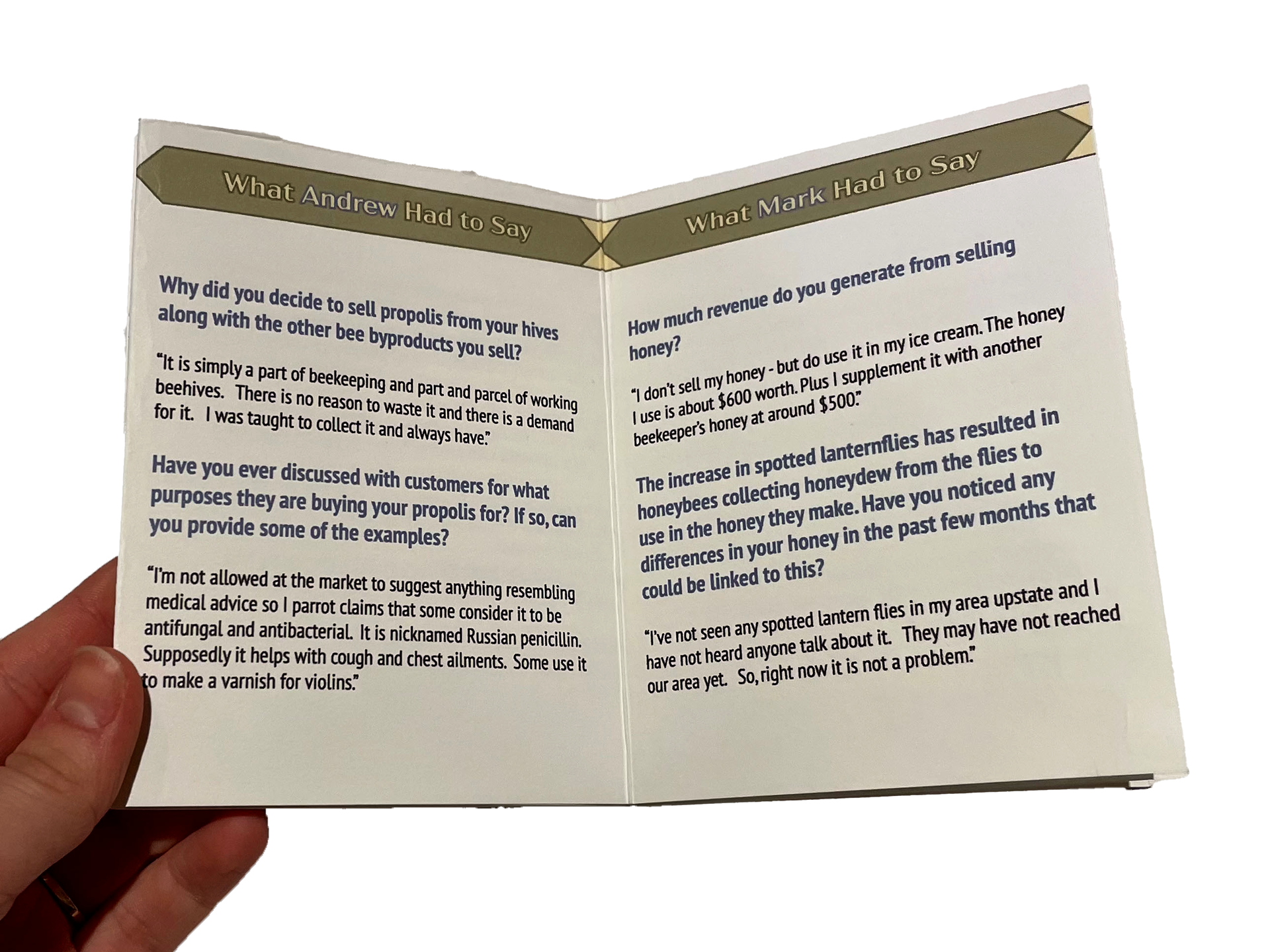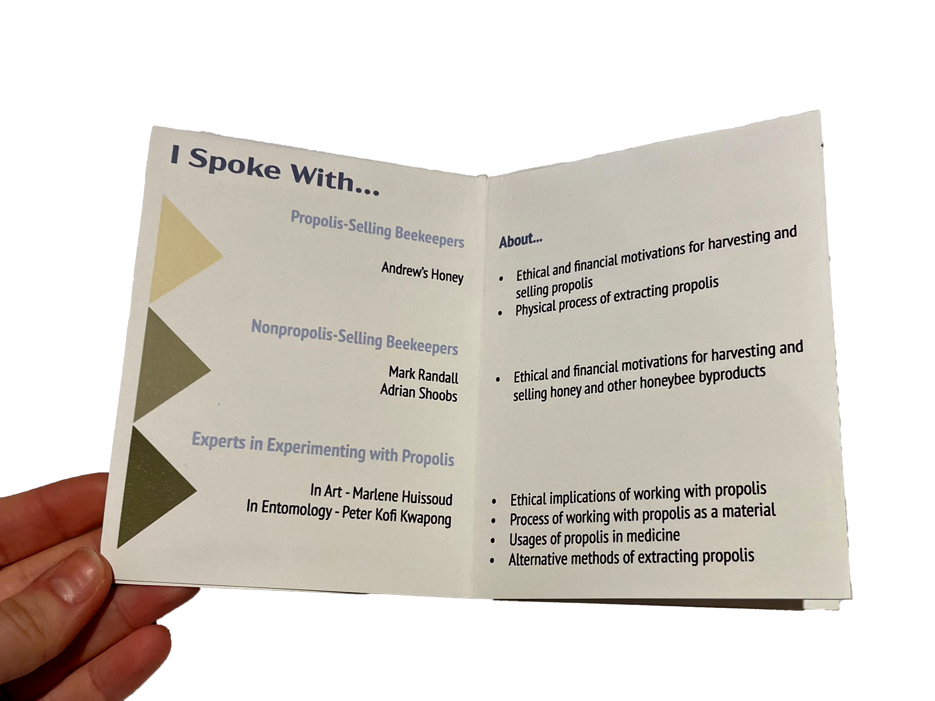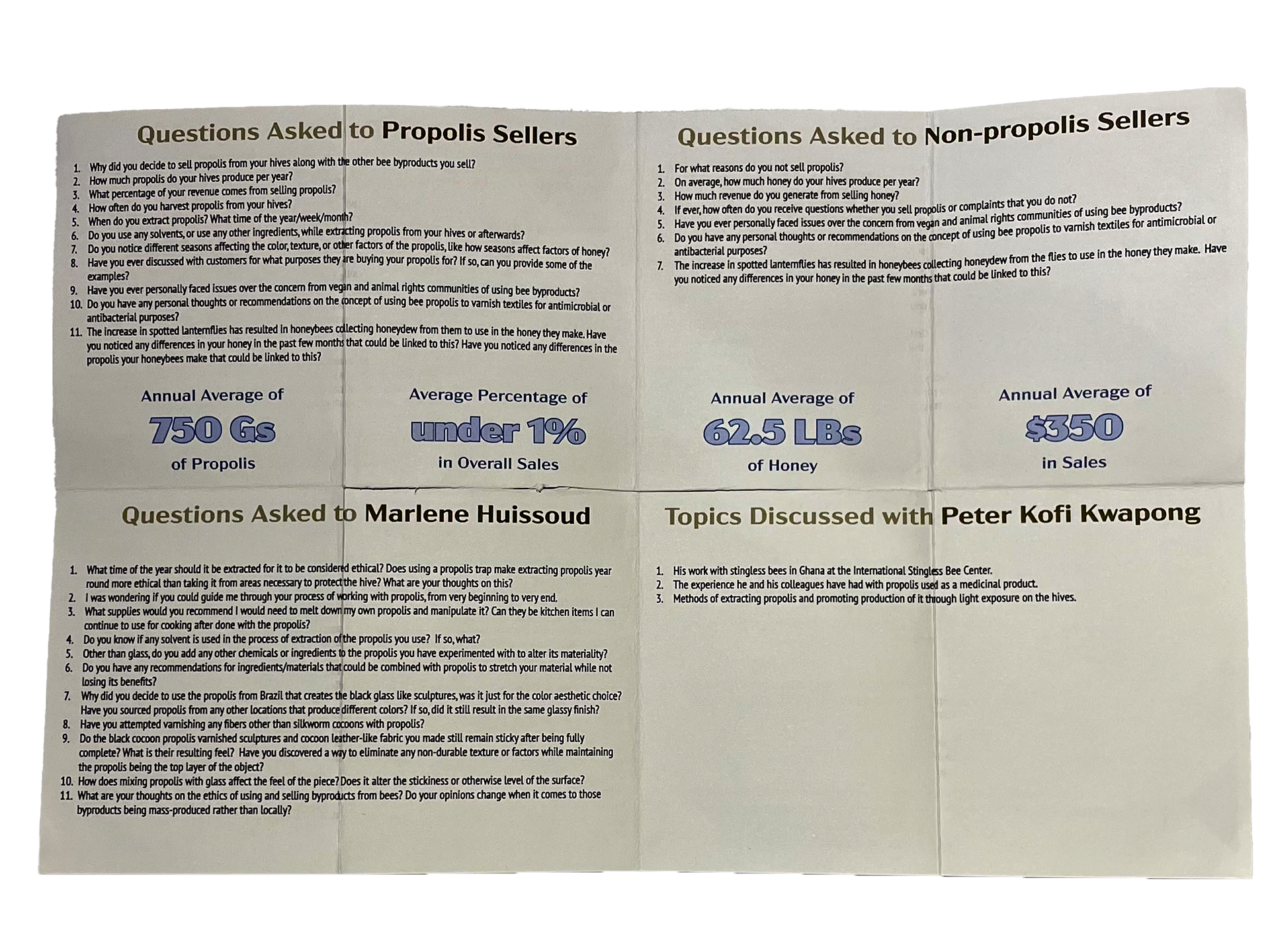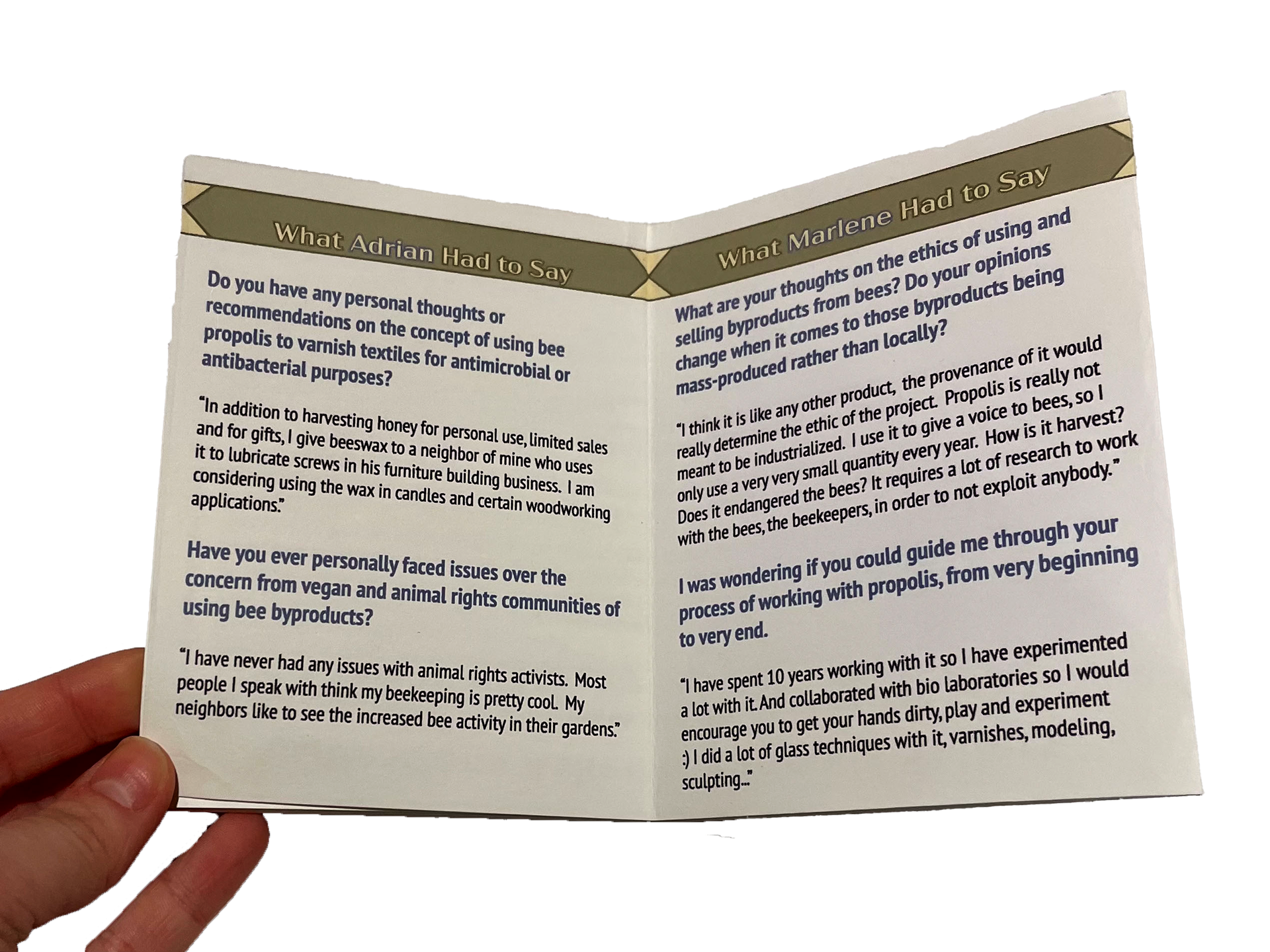 In preparation for my Antifungal Plant Pot project, I conducted a few rounds of research on the honeybee byproduct propolis. In one of these rounds, I interviewed three local beekeepers and one propolis artist on their experiences with the material. I documented these email, zoom, and in-person interviews through the creation of a mini-zine.