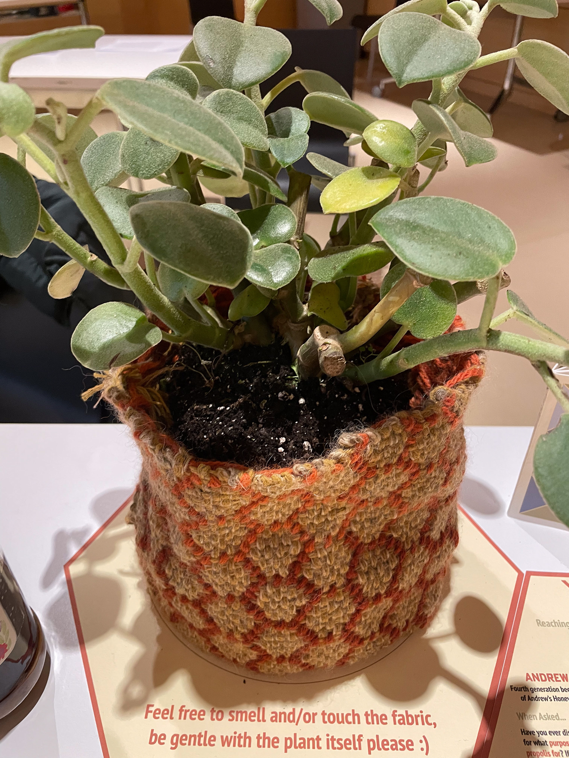 The idea to create a plant pot with fibers soaked in propolis came from my inability to keep house plants alive. They always end up getting root rot. I wondered if there was any benefit to housing a plant in a propolis infused environment. I created a propolis solvent by melting it in heated ethanol, then soaked recycled fibers in the solvent. Then I hand wove the fibers in a honeycomb inspired pattern. For the presentation of my project, I created themed posters to document my research and creation. I was inspired by historical honey packaging and Constructivist graphic styles.