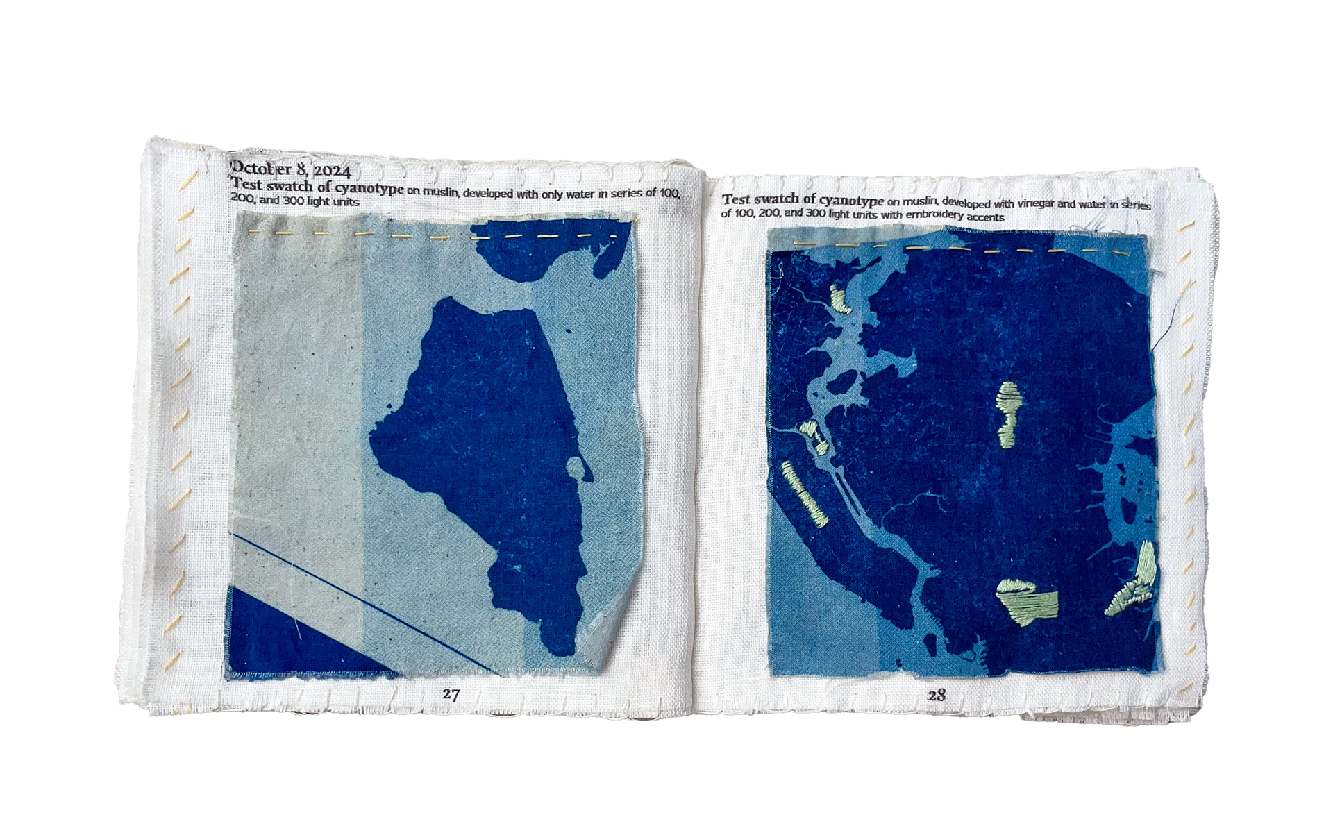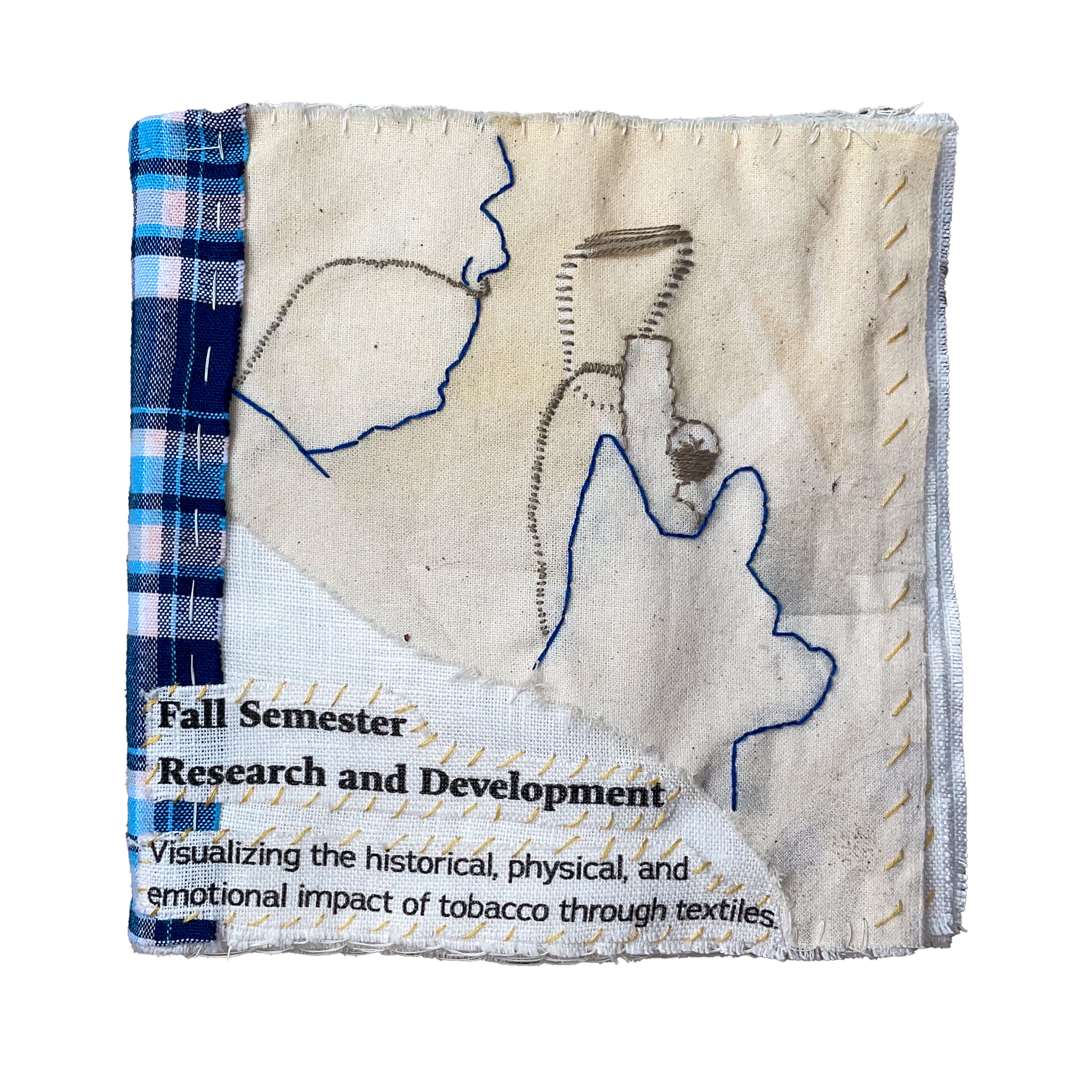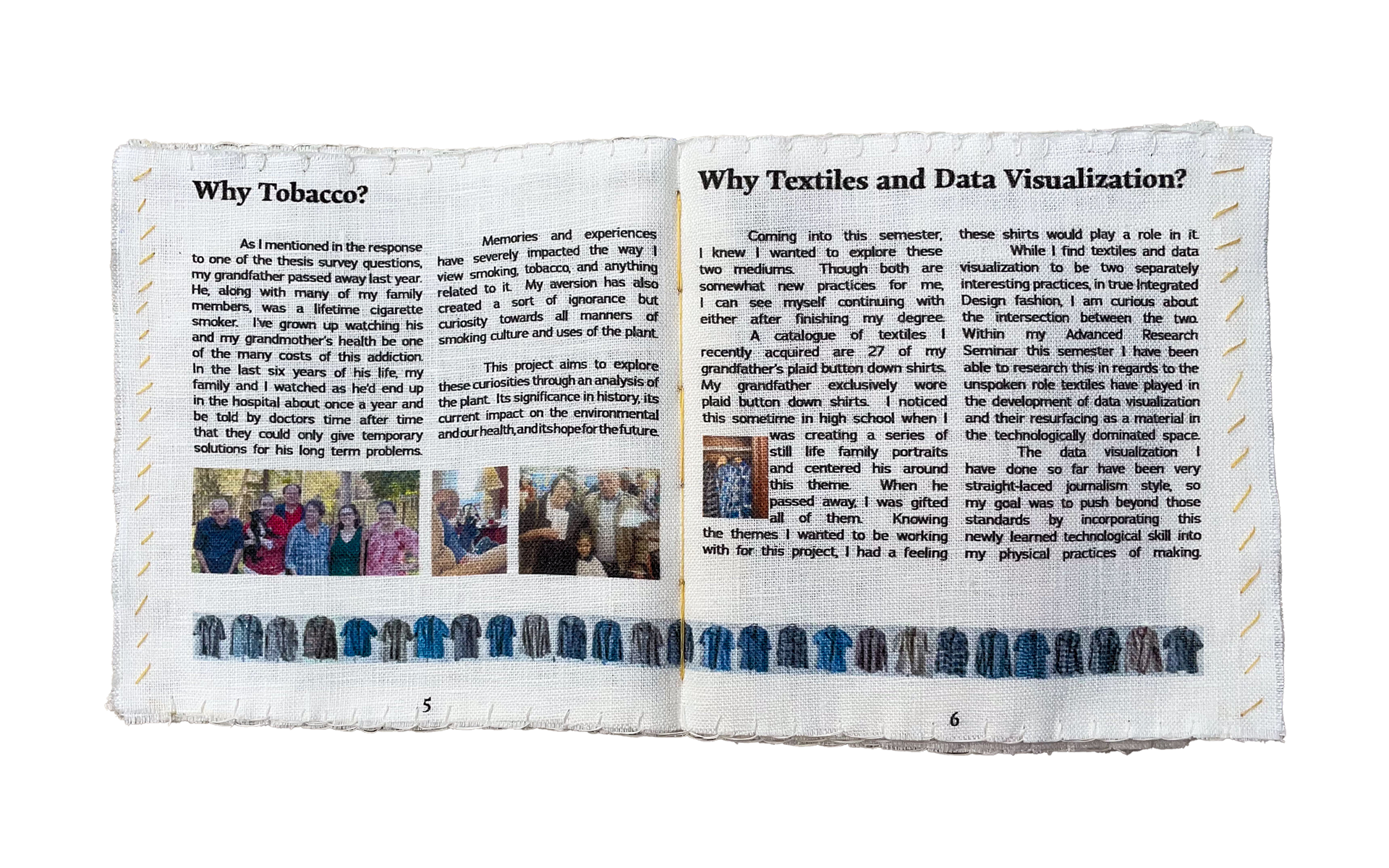 To prepare for my senior thesis project, I spent the majority of my fall semester researching, studying, planning, and prototyping concepts. I then documented this process within a process book which I translated to be printed on linen textile. This was then cut and hand-sewn together into a binded book with a piece of my grandfather's shirt used to cover the raw binded spine. Along with my written research and imagery from the many field trips to museums, the book included embroidery, quilting, and cyanotype samples from throughout the semester.