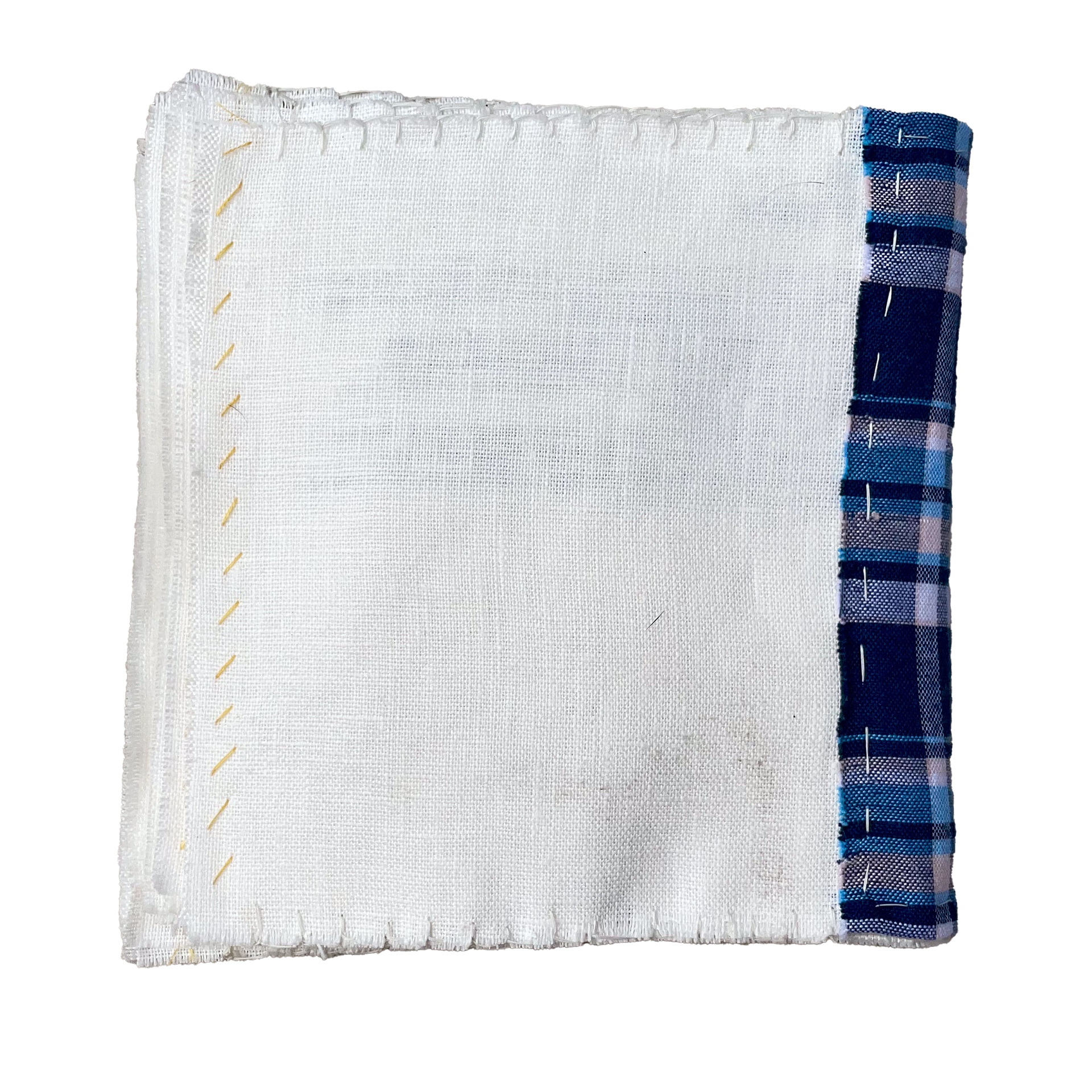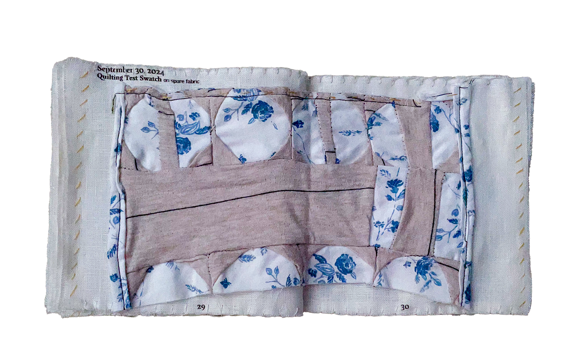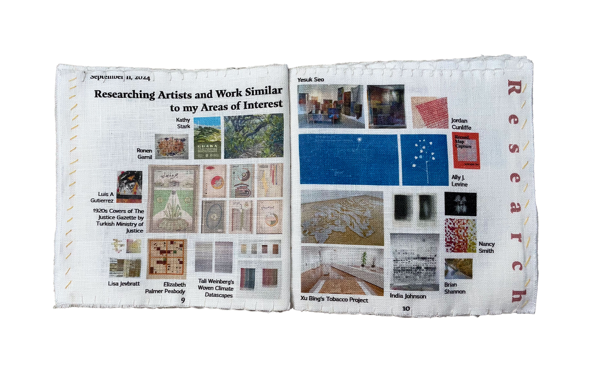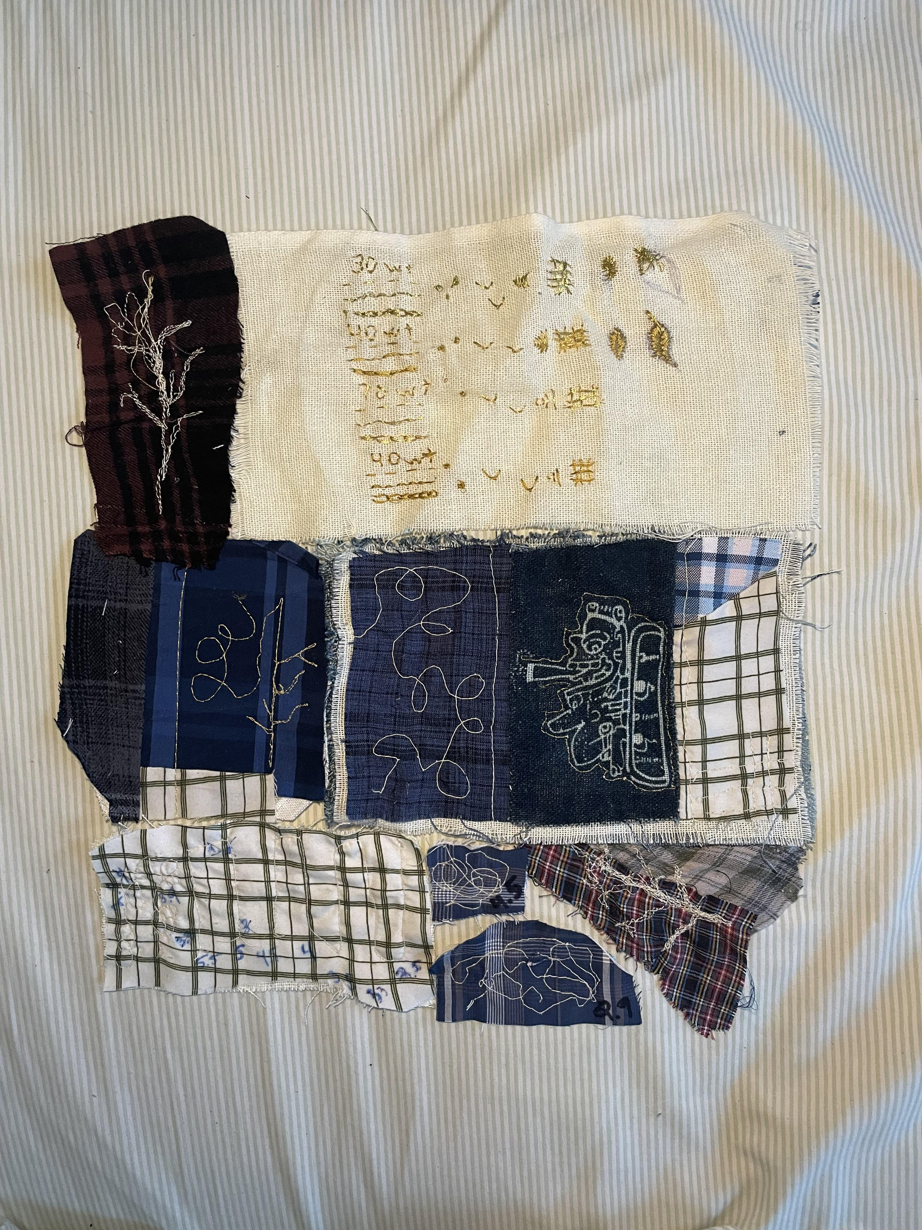 To prepare for my senior thesis project, I spent the majority of my fall semester researching, studying, planning, and prototyping concepts. I then documented this process within a process book which I translated to be printed on linen textile. This was then cut and hand-sewn together into a binded book with a piece of my grandfather's shirt used to cover the raw binded spine. Along with my written research and imagery from the many field trips to museums, the book included embroidery, quilting, and cyanotype samples from throughout the semester.
