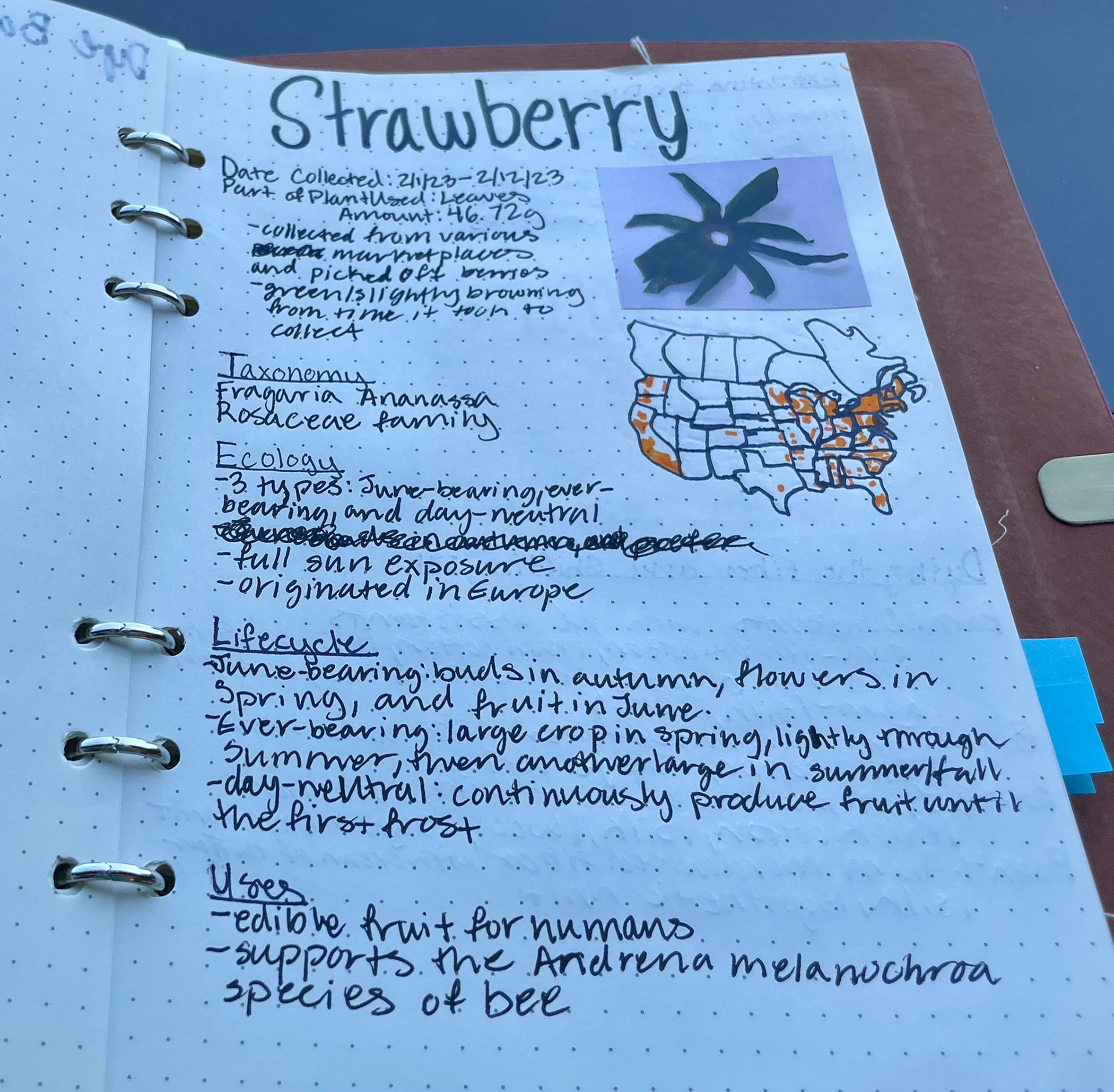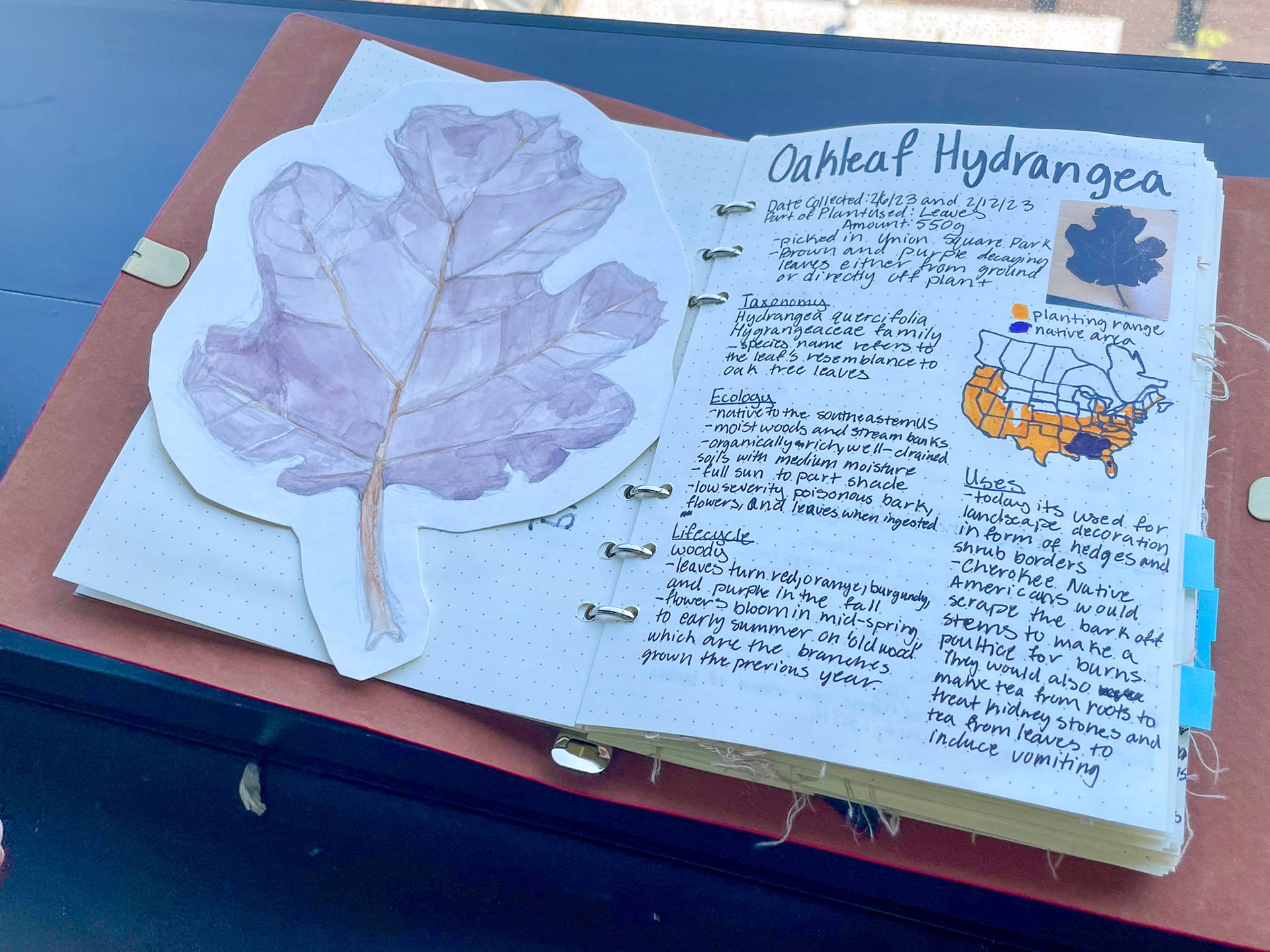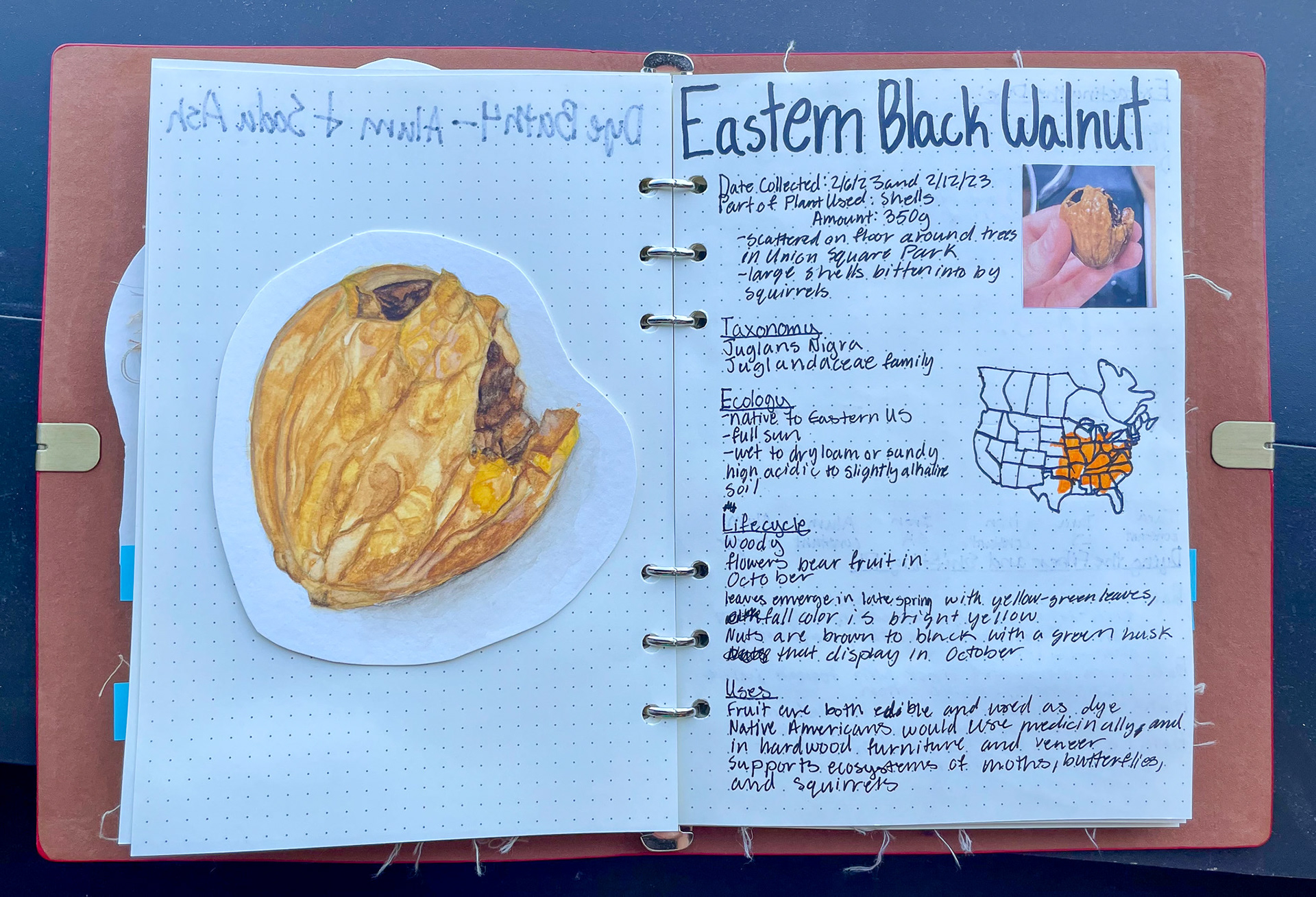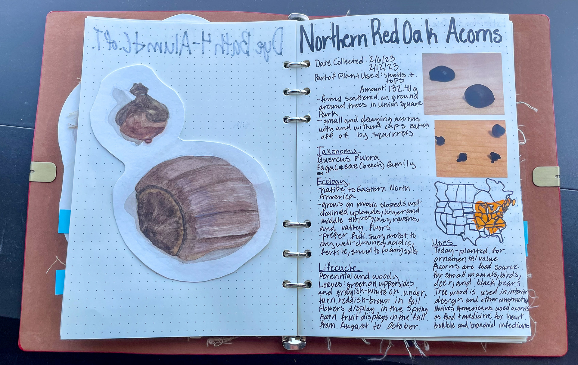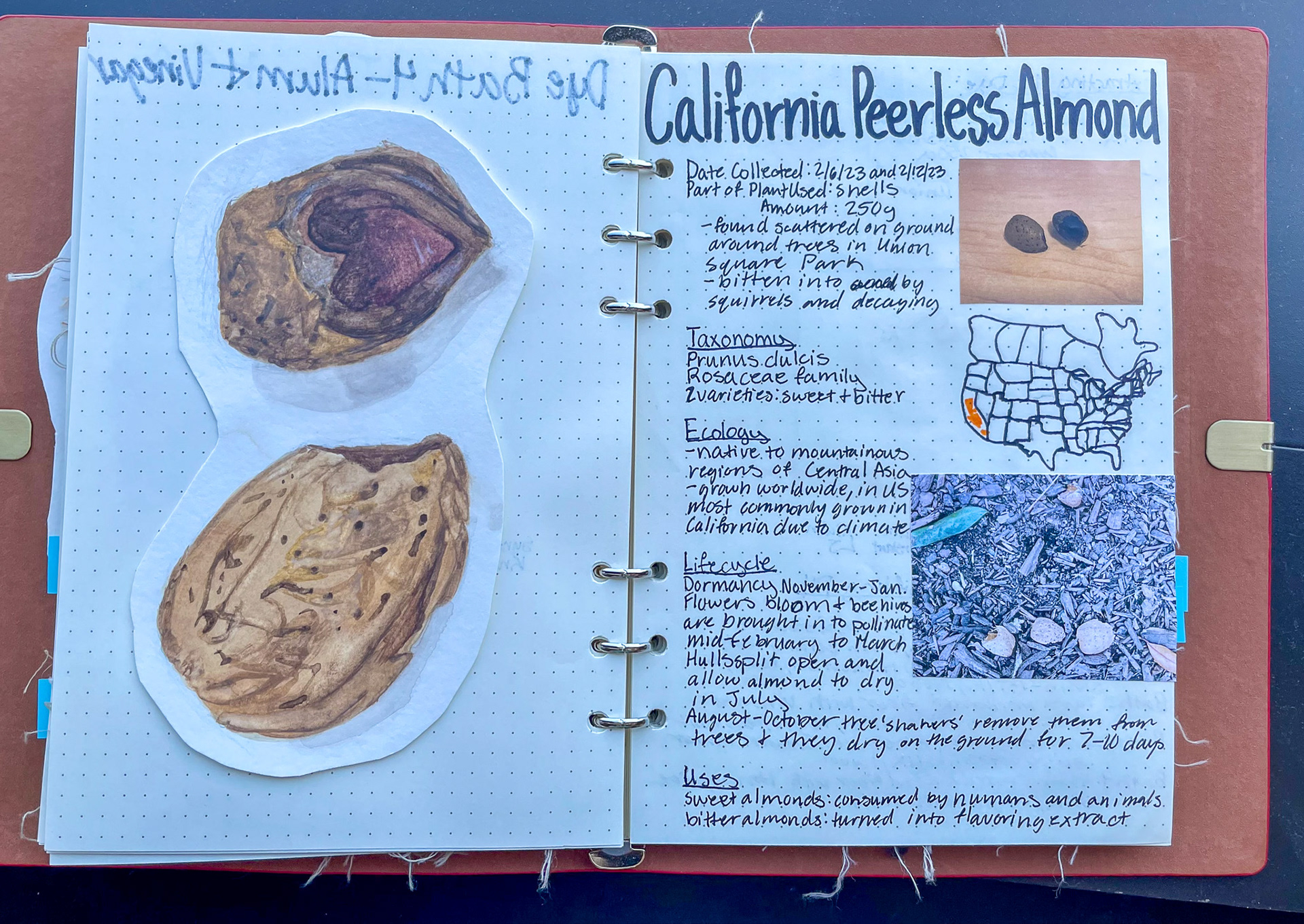 While taking a course called Community Supported Textiles, I had the opportunity to experiment with five locally sourced or personally recycled natural items for dyeing textiles. These included Strawberry leaves collected from strawberries I purchased and ate over many weeks, Oakleaf Hydrangea leaves found in Union Square Park, and the shells of Eastern Black Walnuts, Northern Red Oak Acorns, and California Peerless Almonds all also found in Union Square Park. After collecting my dyeing resources, I boiled the items to extract their dye, then conducted four baths for each dye. The first bath being my constant, with no PH assistants to shift colors, with the next three being baths Tara Powder mordanted textiles dyed with lemon juice, Iron mordanted textiles dyed with Soda Ash, and Alum mordanted textiles with Vinegar. The textiles used were all recycled swatches found in the scrap bins of the fashion department at my school and included silks, wools, and three types of cotton weaves.