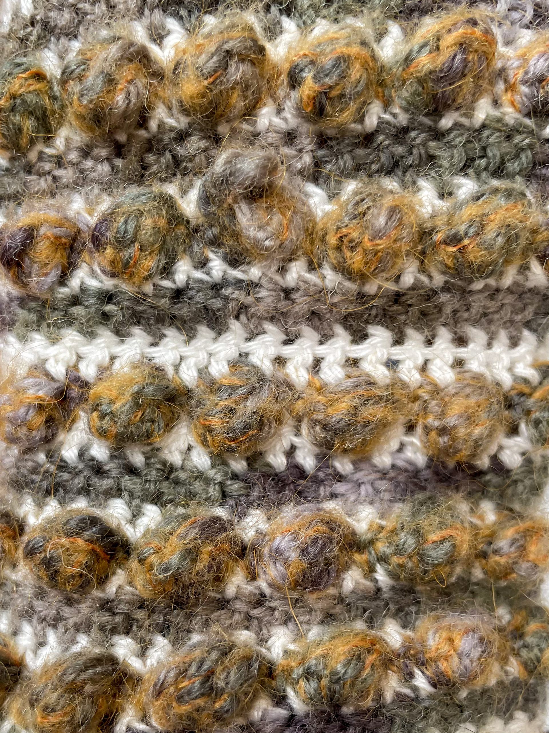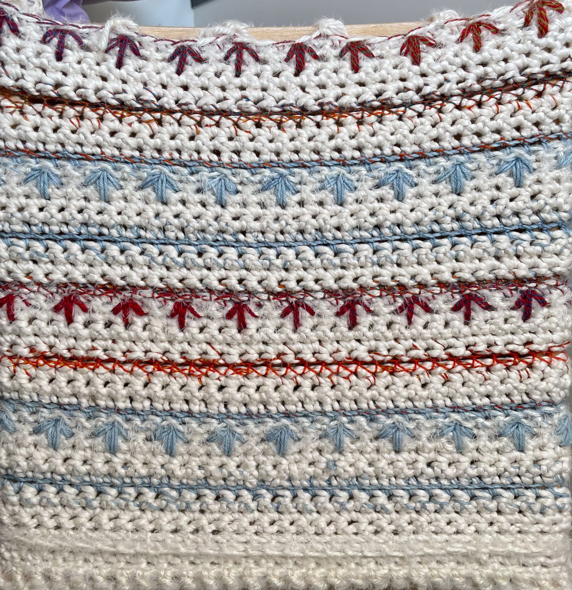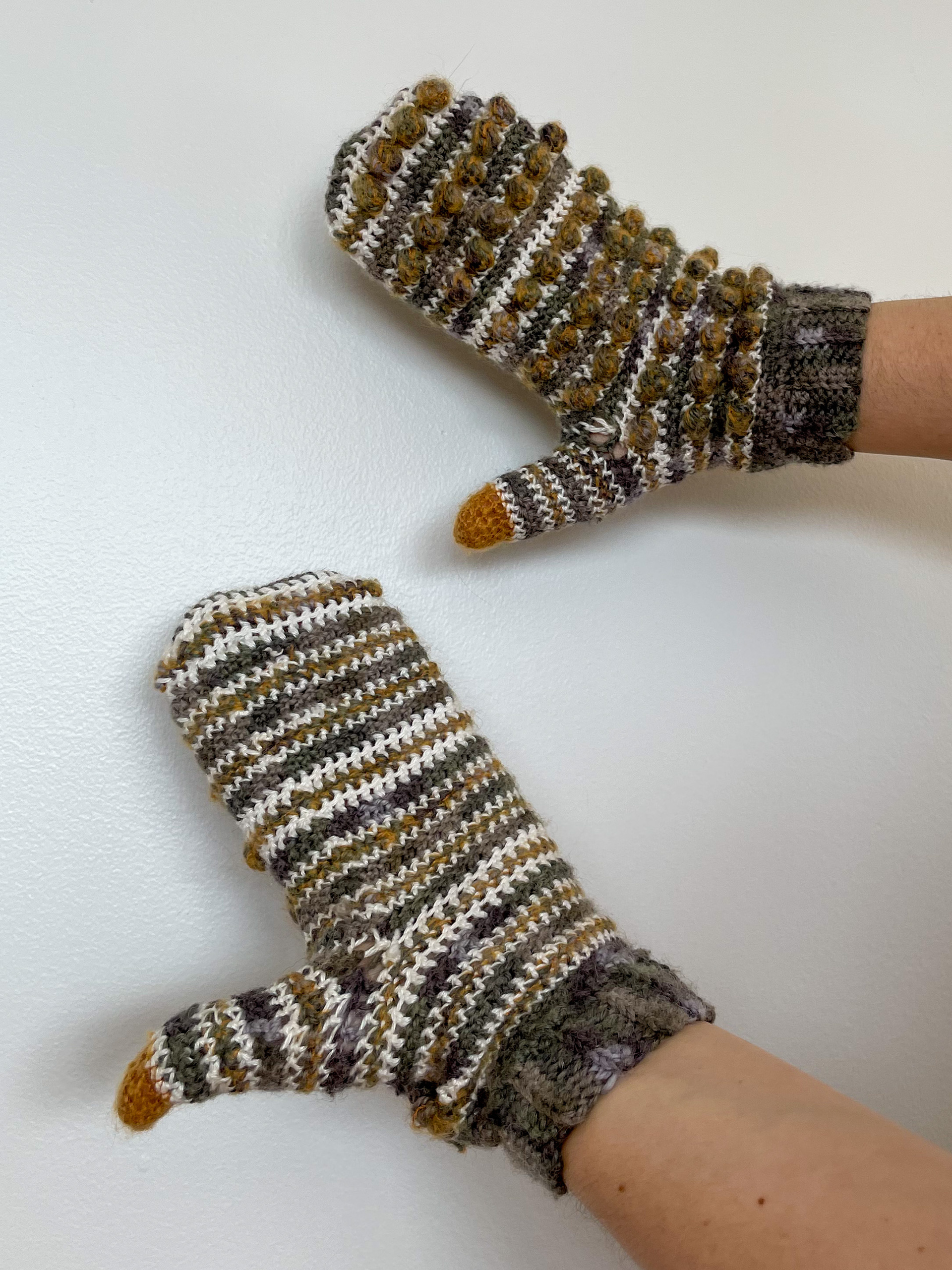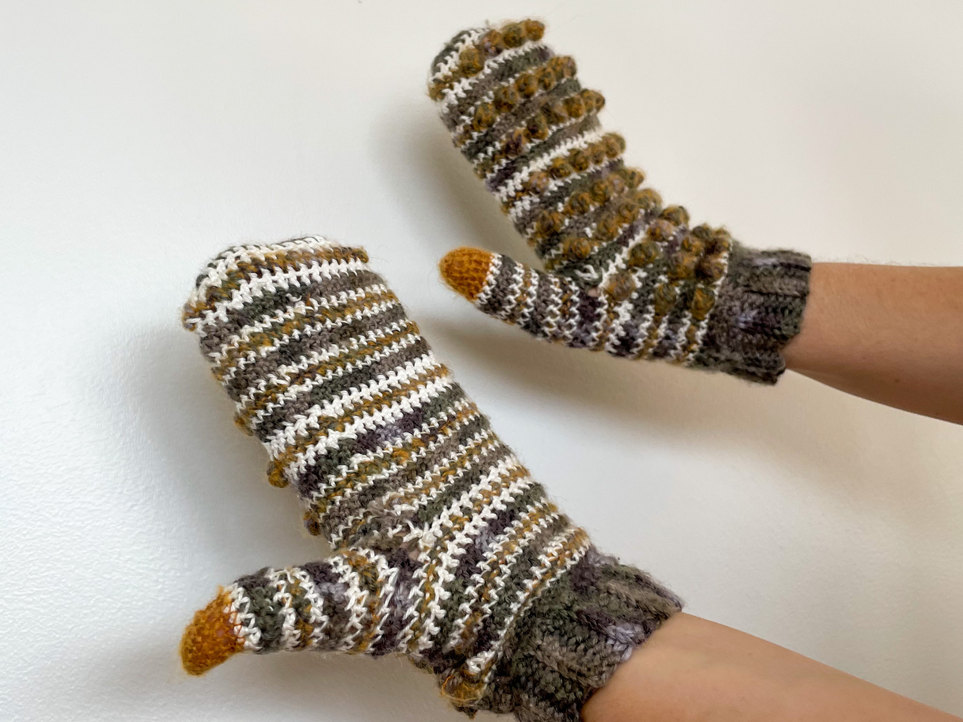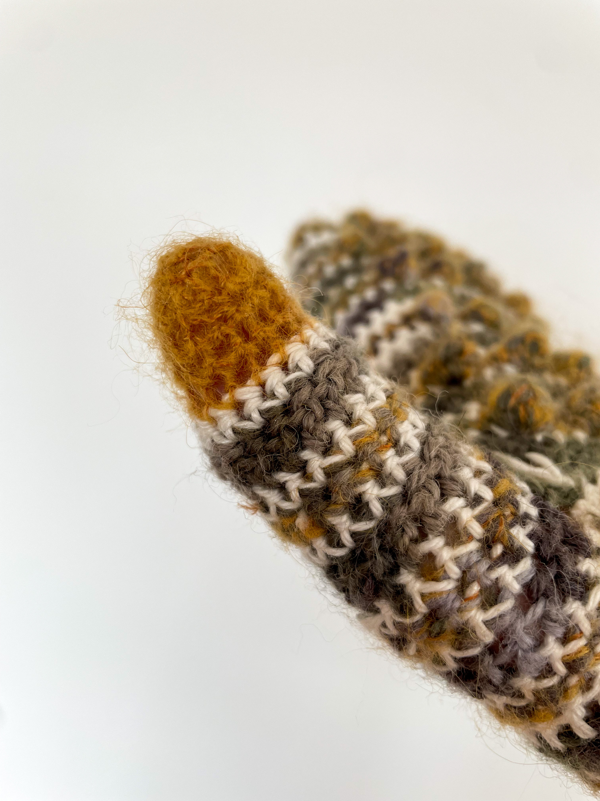 Using a plain mitten pattern found online I crocheted my first pair of mittens. I added my own twist on the design by adding the bubble stitches on the tops and crocheting the thumbs with exclusively mohair, to allow for easier access to phone usage. These were created mainly with second-hand cotton and acrylic yarns, with the only newly purchased fiber being the mohair for added warmth.