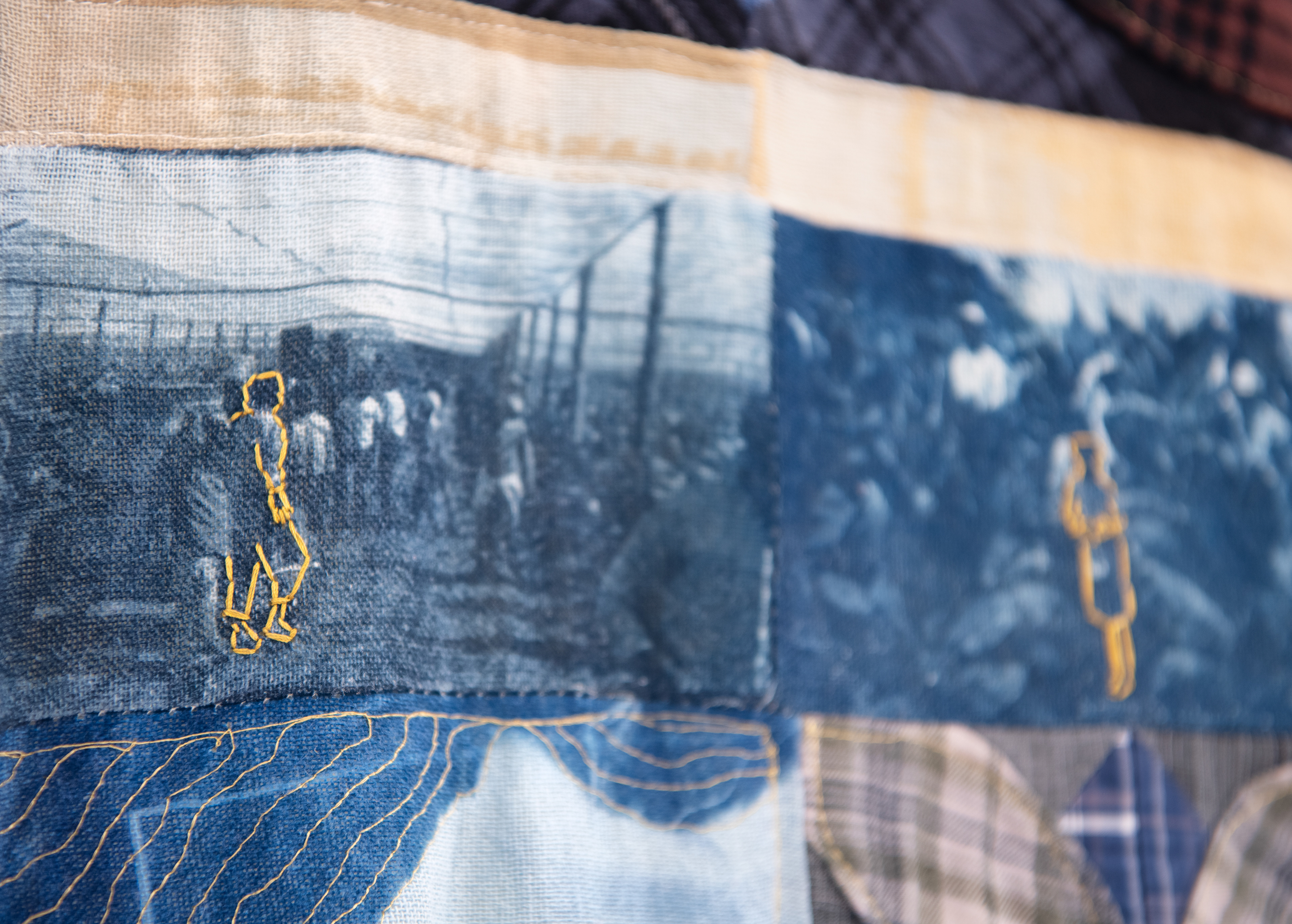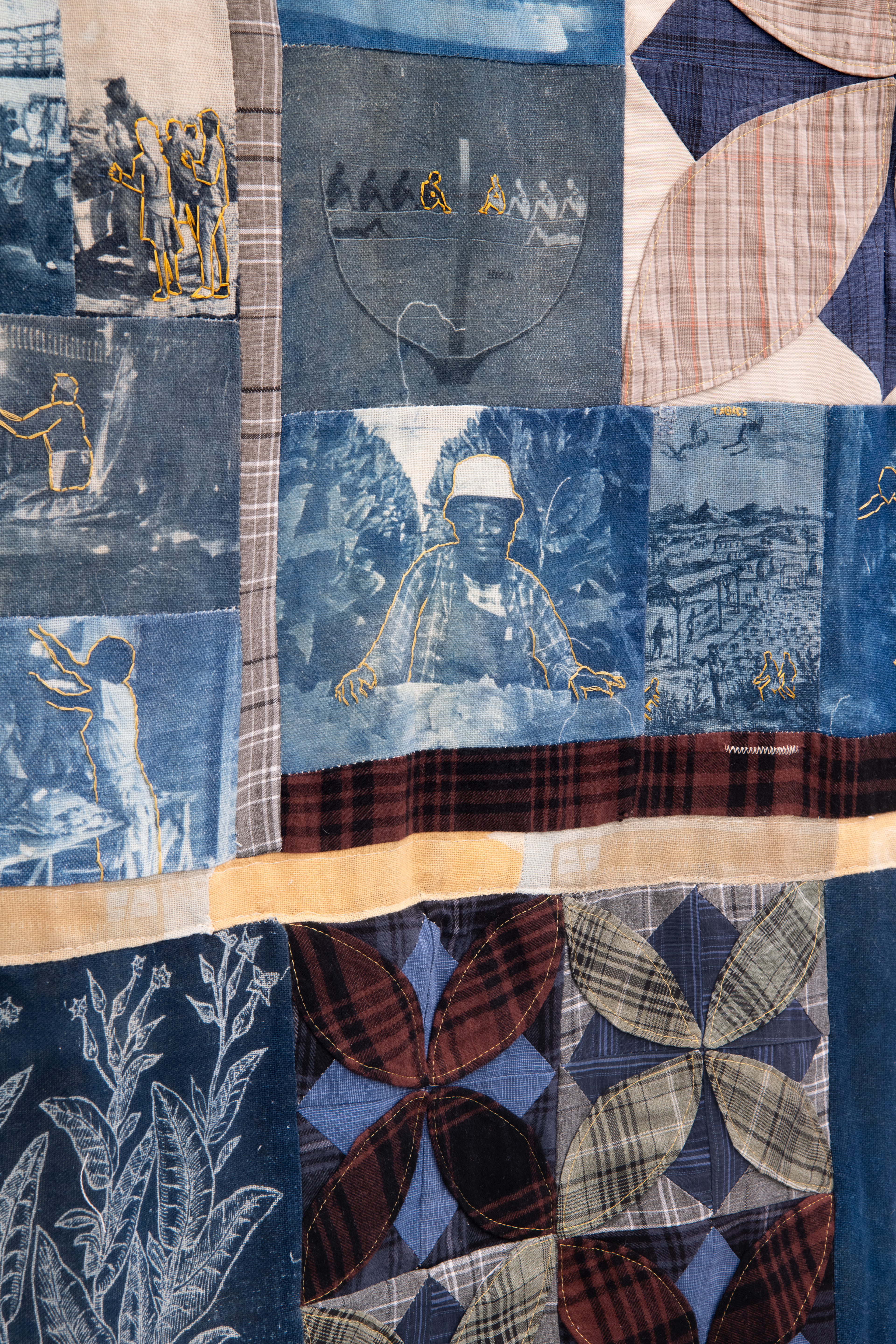 In 2023, my grandfather passed away from a life of smoking cigarettes and his closet of exclusively plaid button-down shirts were passed down to me. Growing up with family members who were addicted to nicotine deeply influenced my negative view on tobacco. Sun-Cured History and Plaid Memories aims to shift my perspective by exploring the history of the tobacco plant and its connections to politics and culture, both in its place of origin, Central America, and in my home region of North Florida and the Piney Woods Belt. Long used by Native Americans for spiritual and recreational purposes, tobacco, often referred to as ‘brown gold,’ became a key motivator for European colonization in the Americas. This demand has been supplied by centuries of slave labor and exploitation of vulnerable communities. Historical images sourced from local and national archives illustrate the role of southern companies like Swisher International, where my great grandmother worked, in shaping this narrative. These images are developed onto cloth used to cover ‘shade tobacco,’ grown in the region, then toned with four types of locally grown tobacco and embellished with gold embroidery. Alongside these visuals, I repurpose my grandfather’s 27 plaid shirts into quilt squares historically rooted in the southern US, depicting motifs of tobacco leaves, industry, and agriculture.