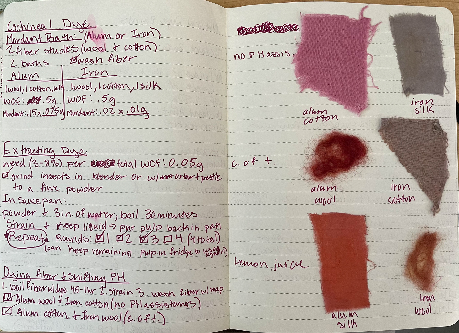 While taking a course called Community Supported Textiles, I also had the opportunity to experiment with the dyeing abilities of the long used historical cochineal bugs across silk, cotton, wool, and linen.
