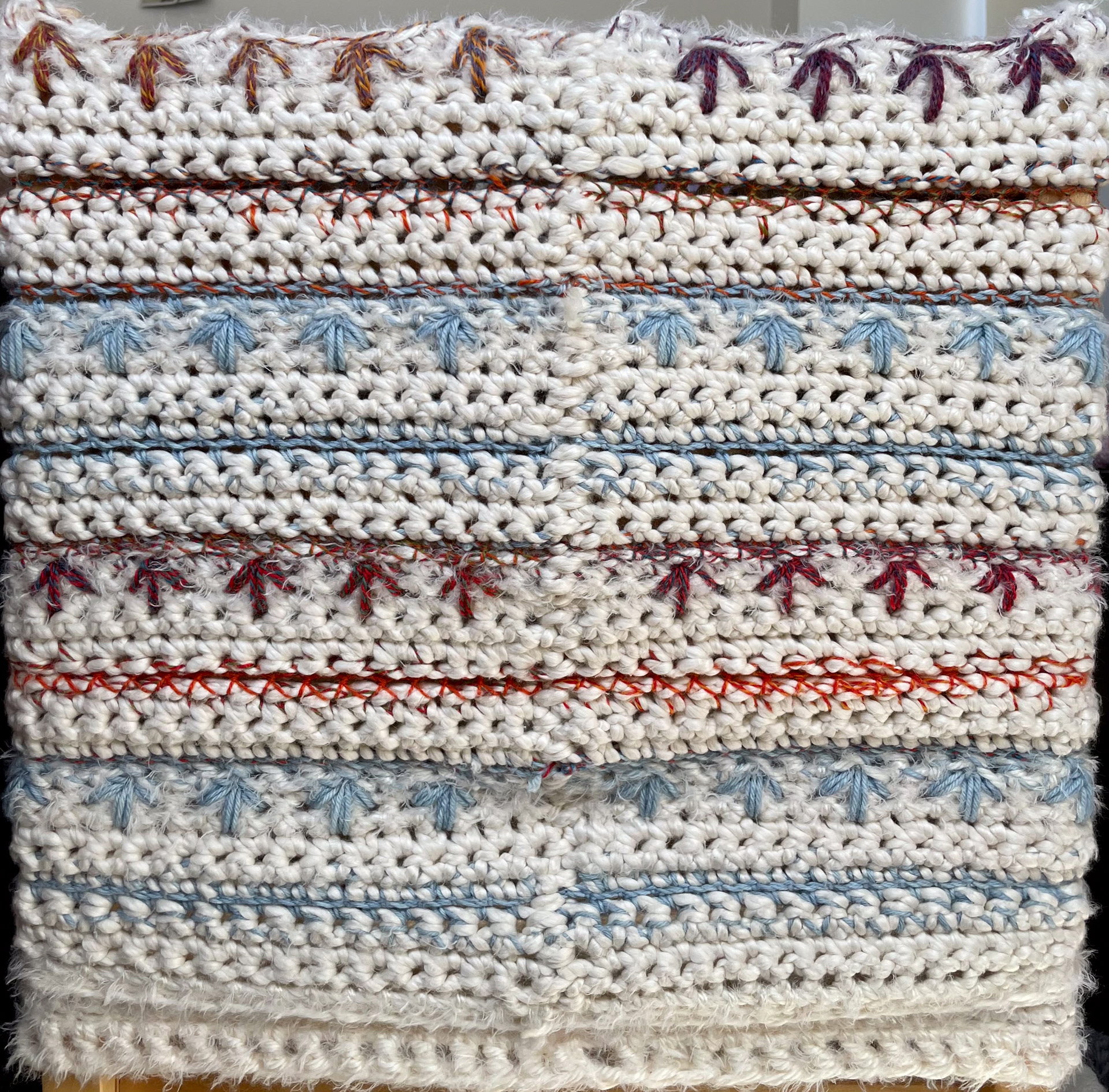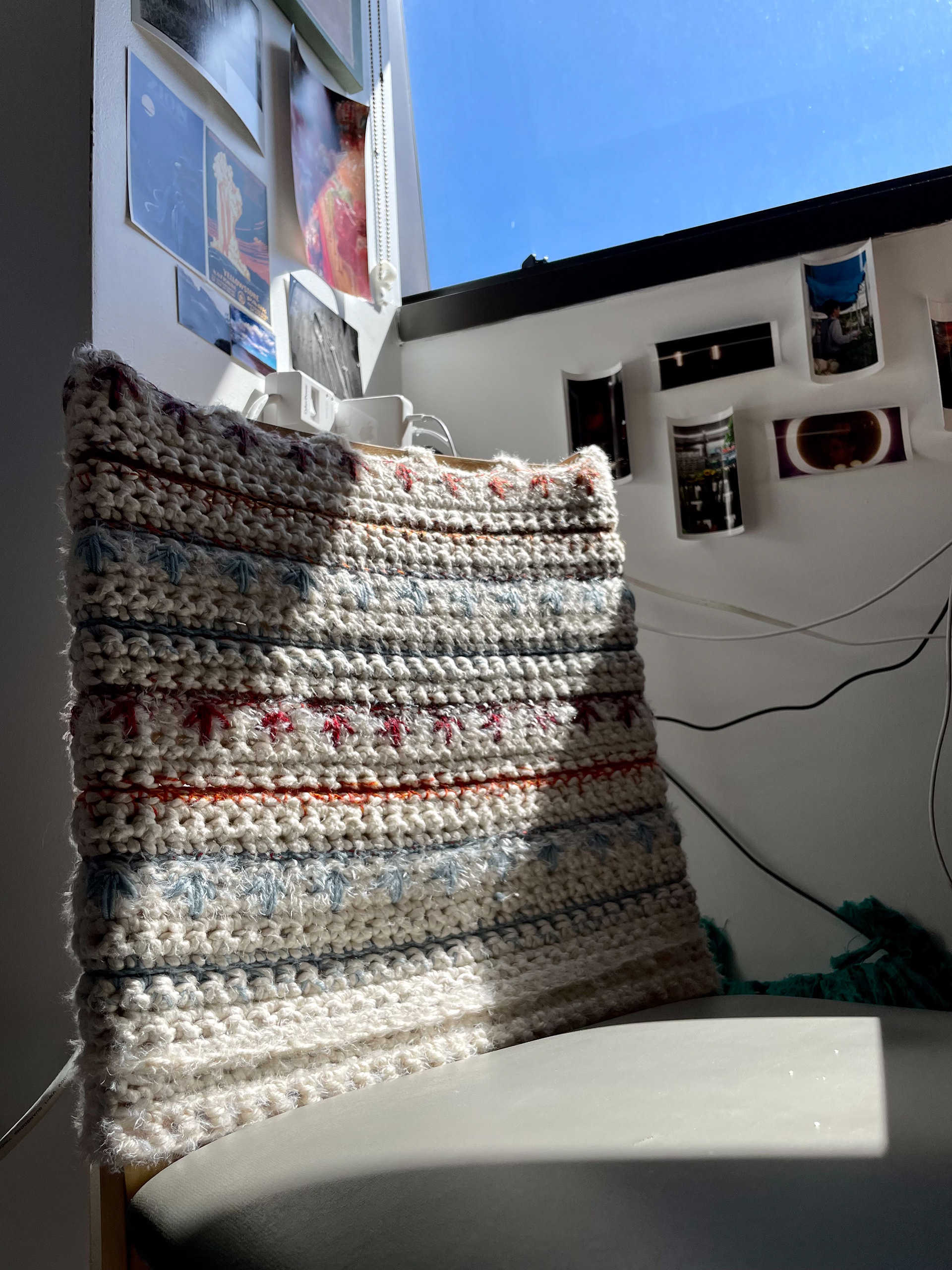 For three years of college, I lived in college dorms, where when I had to sit at my desk to do work, my back was subjected to the stiff wooden backs of our provided dormitory chairs. After my first year of having enough of them, I decided to design a solution by crocheting a cover using a thick wool fiber that would provide extra cushioning to my back during long nights of writing essays. The overall design was fairly simple using white wool yarn as the base with blue and multi-colored wool yarns for decoration with the attempt to add a little more color to my space. The result was a cozy covering that succeeded in making me want to spend more time working at my desk.